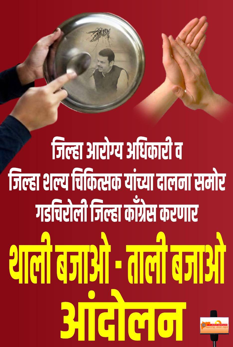 जिला प्रशासन और आरोग्य विभाग की कार्यप्रणाली की पोल खोलने के लिए गढ़चिरौली जिला कांग्रेस के द्वारा जिला शल्य चिकित्सक और आरोग्य अधिकारी के ऑफिस में आज थाली बजाकर आंदोलन किया जा रहा हैं, जिसमें सरकारी लापरवाही से हो रही मौतों को रोकने की मांग कांग्रेस पार्टी द्वारा की जाएगी।