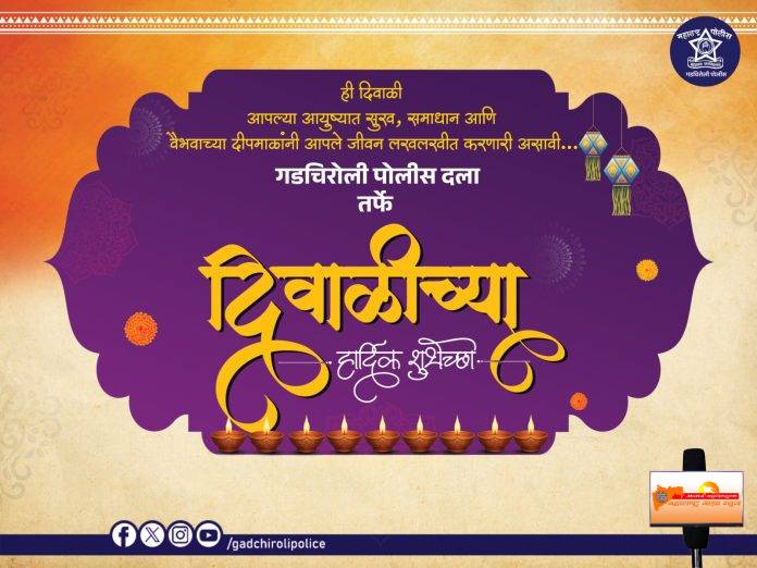 सामाजिक पोलिस अधीक्षक गडचिरोली यांच्या वतीने गडचिरोली जिल्हावासियांना दिवाळी च्या हार्दिक शुभेच्छा…. By Maharashtra maza News - October 21, 2025 0 59 Share WhatsAppTelegramFacebookX