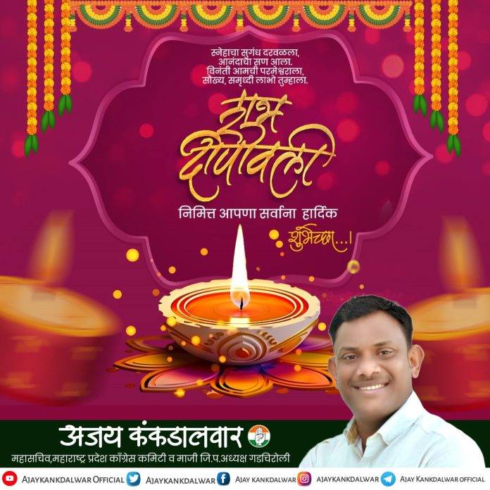 राजकीय काँग्रेस नेते तथा माजी जिल्हा परिषद अध्यक्ष अजय कंकडालवार यांच्या वतीने दिवाळीच्या तेजोमय शुभेच्छा… By Maharashtra maza News - October 21, 2025 0 97 Share WhatsAppTelegramFacebookX