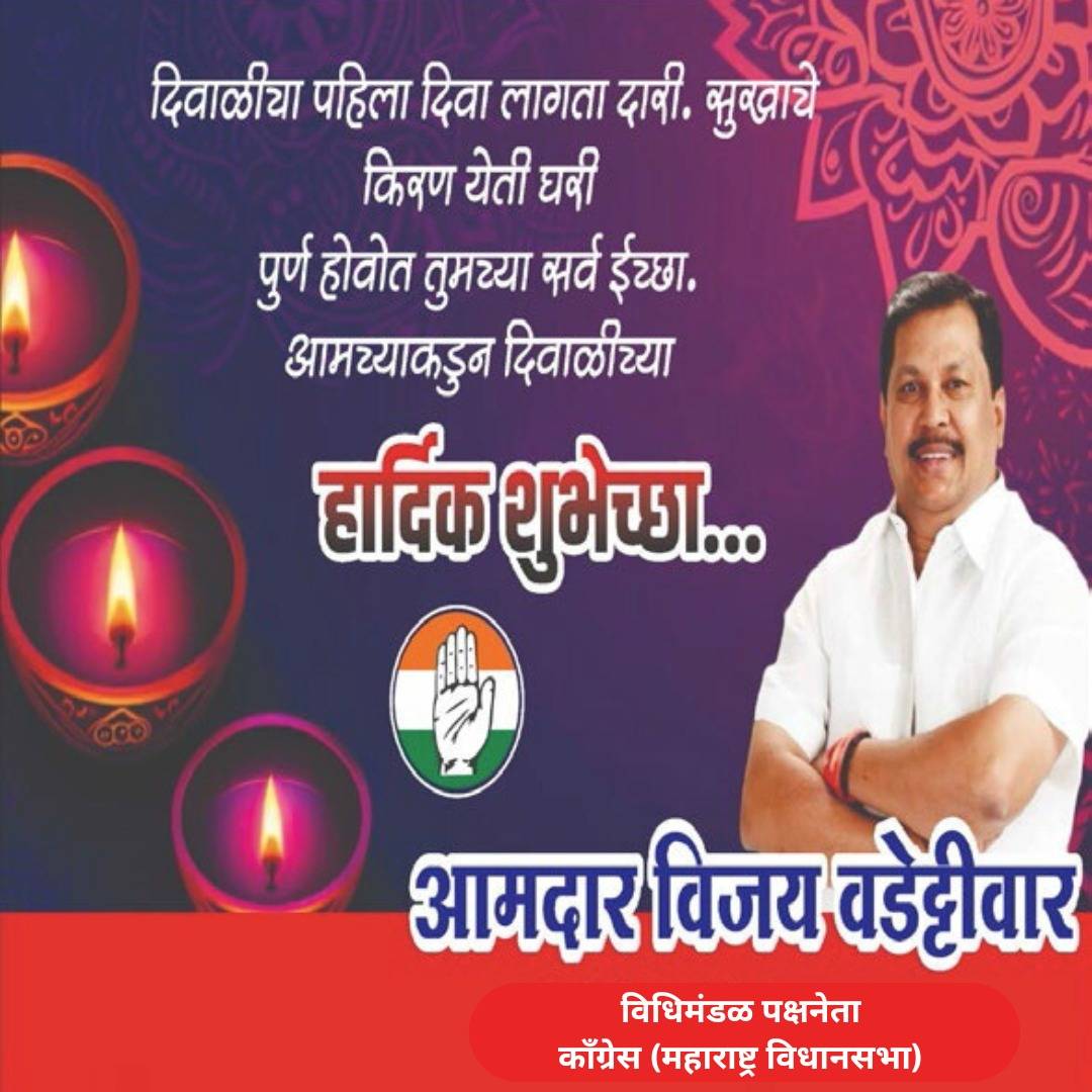 विशेष आमदार विजय वडेट्टीवार यांच्या वतीने दिवाळीच्या तेजोमय शुभेच्छा… By Maharashtra maza News - October 21, 2025 0 48 Share WhatsAppTelegramFacebookX