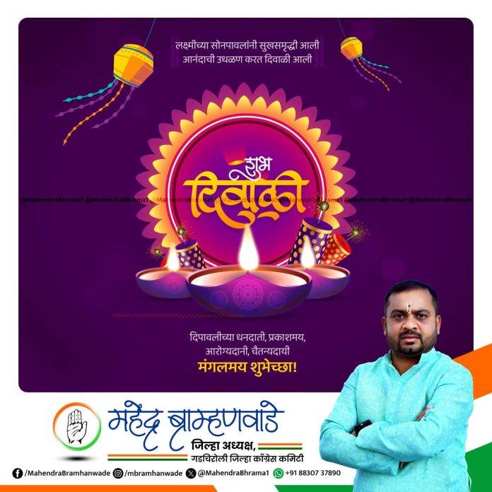 विशेष भारतीय काँग्रेस पक्षाचे गडचिरोली जिल्हाध्यक्ष महेंद्र ब्राम्हणवाडे यांच्या वतीने दिवाळीच्या हार्दिक शुभेच्छा… By Maharashtra maza News - October 21, 2025 0 61 Share WhatsAppTelegramFacebookX