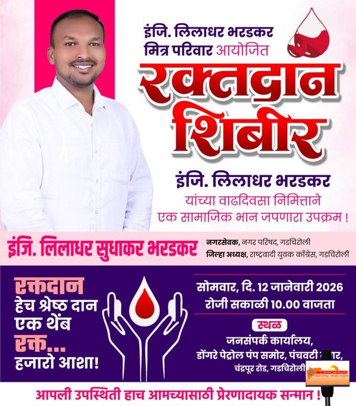 गडचिरोली नगर परिषदेचे नगरसेवक तसेच राष्ट्रवादी युवक काँग्रेसचे जिल्हाध्यक्ष इंजिनिअर लिलाधर सुधाकर भरडकर यांच्या वाढदिवसानिमित्त सोमवार, 12 जानेवारी 2026 रोजी गडचिरोली शहरात विविध सामाजिक उपक्रमांचे आयोजन करण्यात आले आहे. या अंतर्गत भव्य रक्तदान शिबीर तसेच जनसंपर्क कार्यालयाचा उद्घाटन सोहळा आयोजित करण्यात आला आहे.