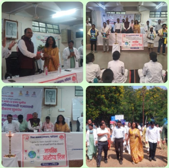 गडचिरोली : जागतिक आरोग्य दिन निमित्त गडचिरोली जिल्ह्यात विविध उपक्रमांच्या माध्यमातून व्यापक आरोग्य जनजागृती करण्यात आली. “एकत्रित प्रयत्न आरोग्यासाठी, विज्ञानाची साथ भविष्यासाठी” या ब्रीदवाक्याखाली सामान्य रुग्णालय, गडचिरोली येथून भव्य जनजागृती रॅली काढण्यात आली. या रॅलीत अधिकारी-कर्मचारी, वैद्यकीय तज्ञ तसेच दुर्गम भागातील पारंपरिक वैद्य व पुजाऱ्यांनी उत्स्फूर्त सहभाग नोंदवला.